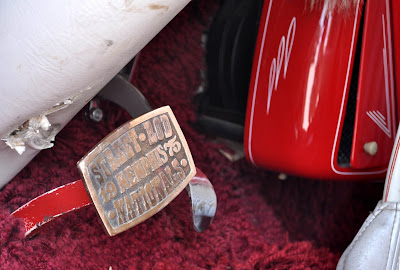 That sets it off, that is cool. The bit of chrome trim on the crest is a nice touch too Nice ? ! ! Oh yeah, and he was a Bonneville with it when American Rodder magazine or Street Rodder, I can't recall which he said and we talked about both of them, did a photoshoot of it. Right there on the salt. That is awesome, hot rod legendary stuff, a photo feature of your hot rod, on the salt An 8 track! I dig that, he still has a shag carpet too. A Street Rod Nationals belt buckle from 1975, as the brake pedal... you've never thought of making your hot rod award a face for your pedals. I like that. Damn cool Thanks George!